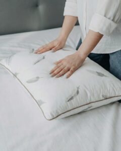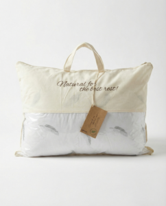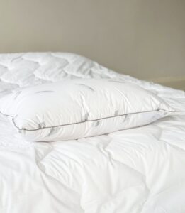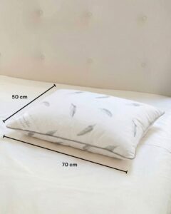 Tyynyn sisäkerros on täytetty ankan höyhenillä ja untuvoilla, tarjoten tiiviin ja muodon säilyttävän pohjan. Ulommat kerrokset on täytetty hanhen untuvoilla ja höyhenillä, jotka antavat tyynylle pehmeän, pehmeän ja pörröisen tunteen. Tämä yhdistelmä tarjoaa erinomaisen tasapainon – tyyny on sekä pehmeä että riittävän joustava, jotta pää ja kaela saavat oikean tuen.