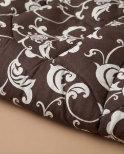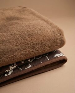 Peiton toinen puoli on valmistettu kameli- ja merinovillan sekoituksesta, mikä lisää pehmeyttä ja lämpöä. Toinen puoli on 100% puuvillaa – lempeä ihoa vasten, luonnollinen ja hengittävä.