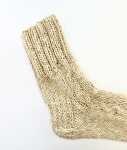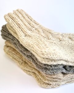 Nämä sukat on neulottu lammas- ja koiranvillan sekoituksesta. Lampaanvilla antaa pehmeyttä ja lämpöä, kun taas koiranvilla lisää vahvuutta ja kestävyyttä. Tämän yhdistelmän ansiosta sukat pitävät lämpöä hyvin, antavat jalkojen hengittää ja pysyvät kestävinä jopa tiheässä käytössä.