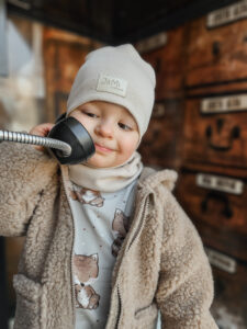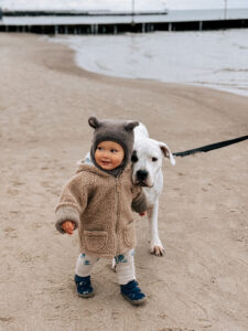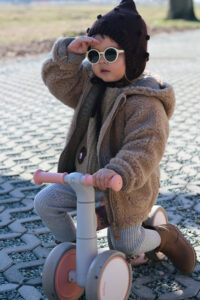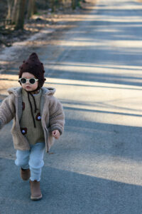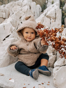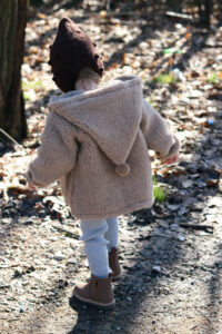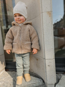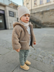Pehmeä ja erittäin lämmin lasten takki hupulla. Takissa on kaksi pientä taskua ja vetoketjukiinnitys. Huppu on koristeltu pompulalla. Sen tyylikästä ulkonäköä täydentävät ekologisen nahan yksityiskohdat.